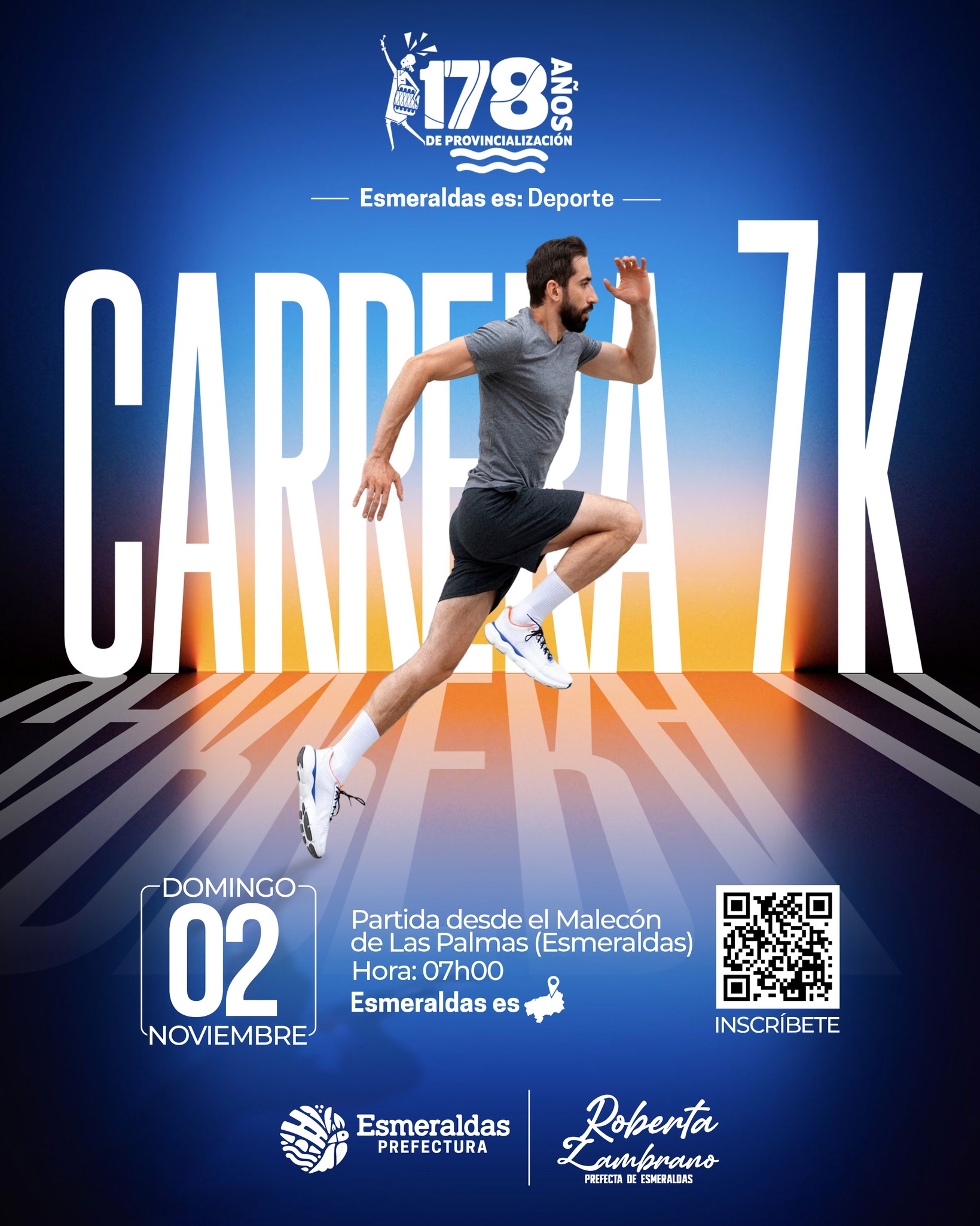 En el marco de la celebración por los 178 años de provincialización de Esmeraldas, la Prefectura invita a toda la ciudadanía a participar en la gran “Carrera 7K”, que se llevará a cabo el domingo 2 de noviembre. Este evento deportivo busca destacar el espíritu de unidad, esfuerzo y alegría que caracteriza al pueblo esmeraldeño.