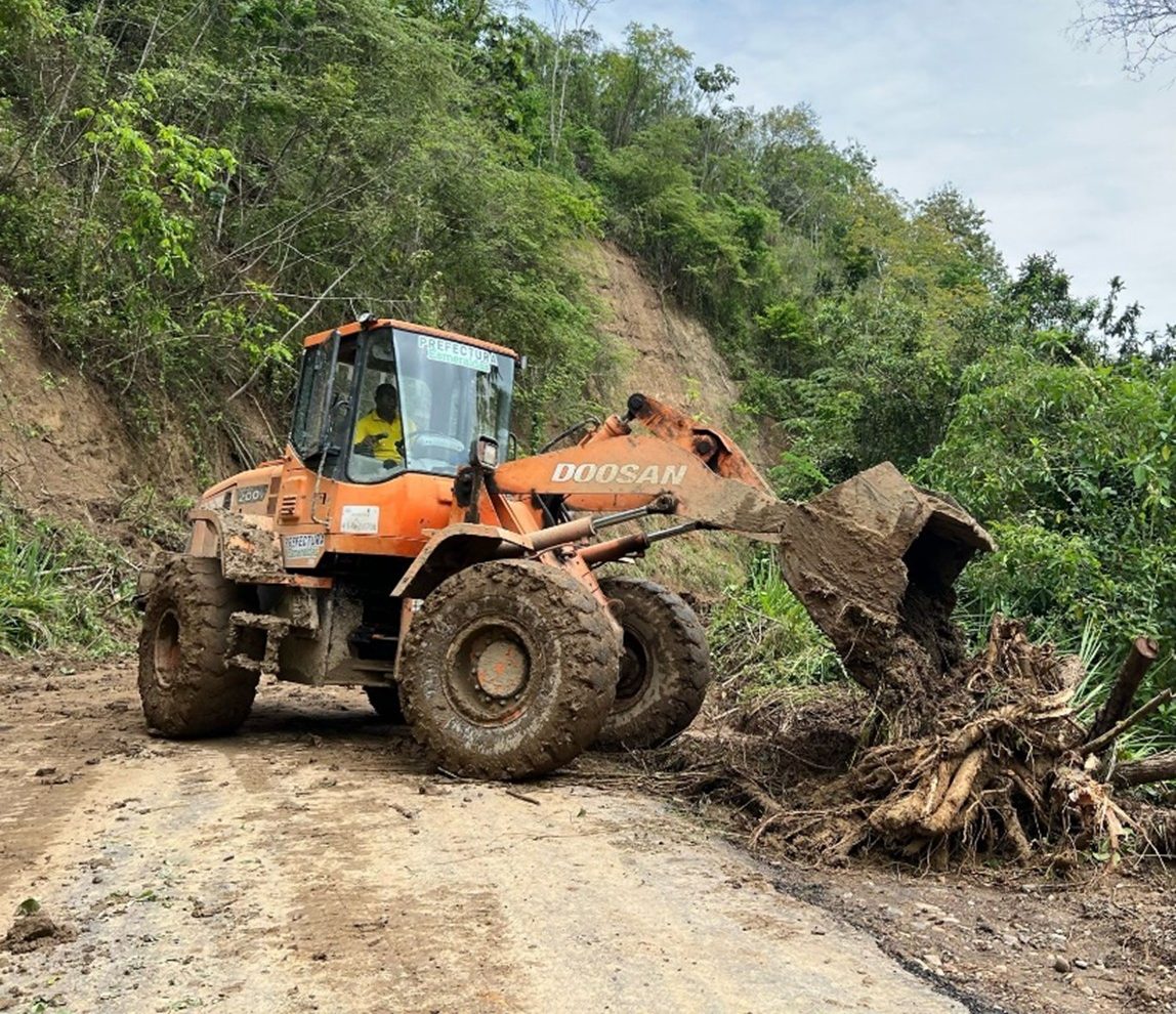 Actualmente, equipos camineros de la Prefectura ejecutan trabajos de limpieza y desalojo de derrumbes en la cuenca del río Colope, cantón Esmeraldas, específicamente en el camino vecinal Carmelita – Caimito – Meribe, el cual resultó afectado por deslizamientos de tierra.